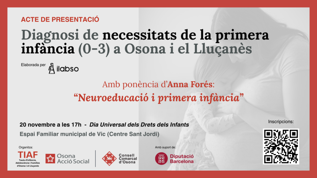 Es presentarà la Diagnosi de necessitats de la primera infància (0-3) a Osona i el Lluçanès, elaborada per Ilabso-Olma SCCL, amb el suport tècnic de la Diputació de Barcelona, i conjuntament amb el Grup de Treball de Primera Infància, el qual ofereix una visió integral sobre les condicions de vida, les necessitats i les oportunitats de les famílies amb infants petits. L’estudi, basat en 686 enquestes a famílies i a diversos grups de discussió, revela dades clau com: