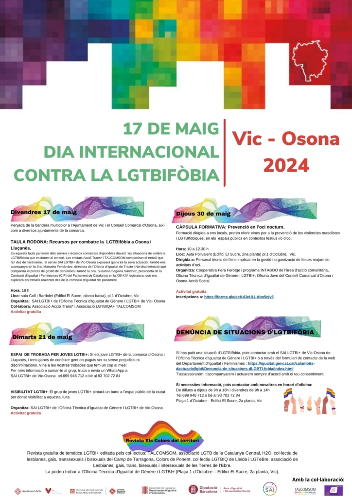 El 17 de maig es penjarà la bandera multicolor a diversos ajuntaments d’Osona i el Lluçanès, seguit d’una taula rodona a Vic sobre els recursos disponibles per combatre la LGTBIfòbia. El 21 de maig es farà una trobada per joves LGTBI+, i el 30 de maig una càpsula formativa sobre la prevenció de violències en l’oci nocturn. A més, es promou la denúncia de situacions de LGTBIfòbia a través del Servei d’Atenció Integral LGTBI+ de l’OTIG